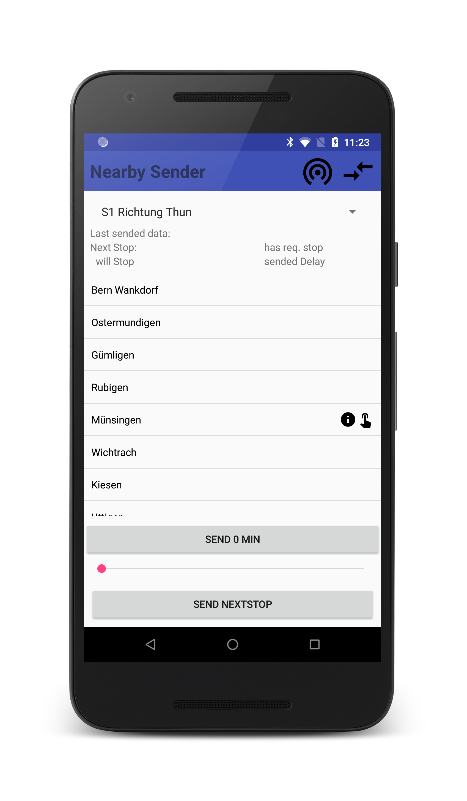 Die Sender-Applikation enthält die verschiedenen Audiofragmente und die Informationen zum Zuglauf. Diese App sendet ein Signal aus, dass der Service zur Verfügung steht.